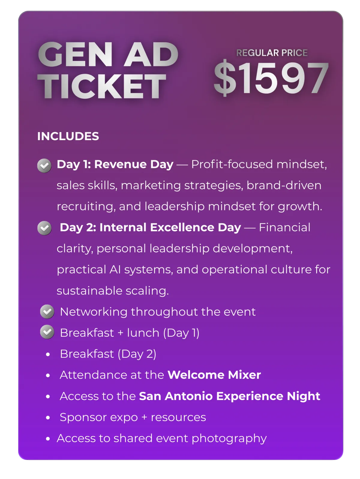 Tickets are transferable but non-refundable. If you cannot attend, you may assign your ticket to another team member or owner in your organization.