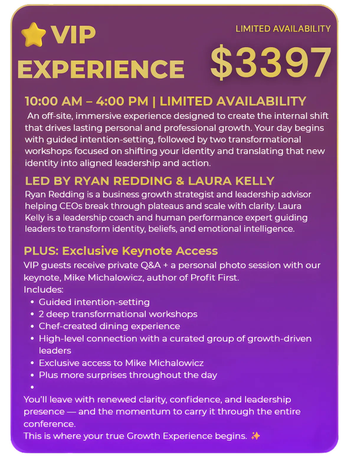 Not at all. VIP offers additional visibility assets and early access experiences, but all attendees receive full access to sessions, networking, brunch, and group activities.